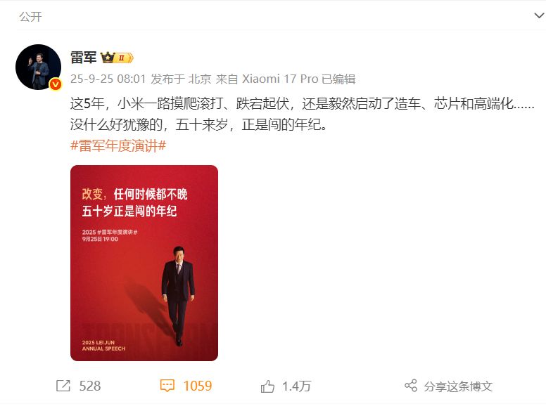 9月25日,小米集团董事长兼CEO雷军发微博称:这5年,小米一路摸爬滚打、跌宕起伏,毅然启动了造车、芯片和高端化……没什么好犹豫的,五十来岁,正是闯的年纪。