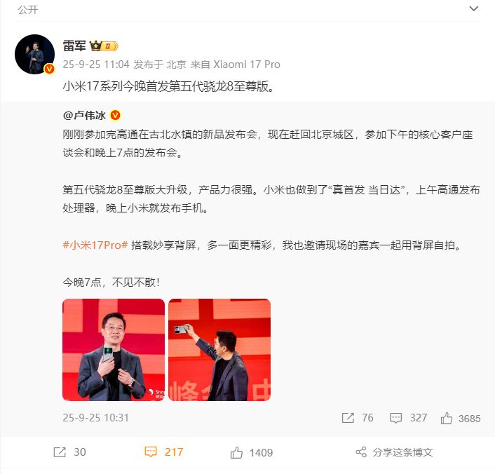 4、不少人关心小米17系列的价格。其实,上周卢总已经跟大家说过。小米17标准版,在大幅升级的同时,“加量不加价”;小米17 Pro和小米17 Pro Max,定位会继续上探,定价晚上公布。