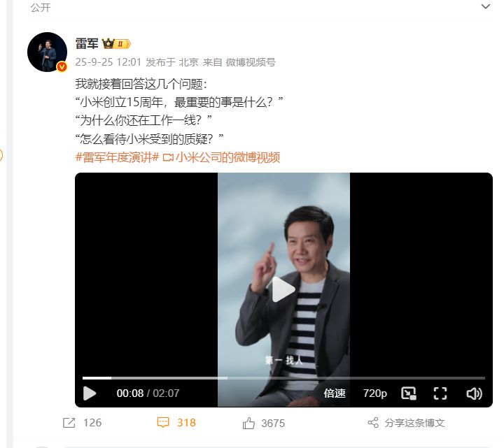 雷军还在最新的视频中回答了小米创立15周年,最重要的事是什么,为什么还在工作一线等问题。